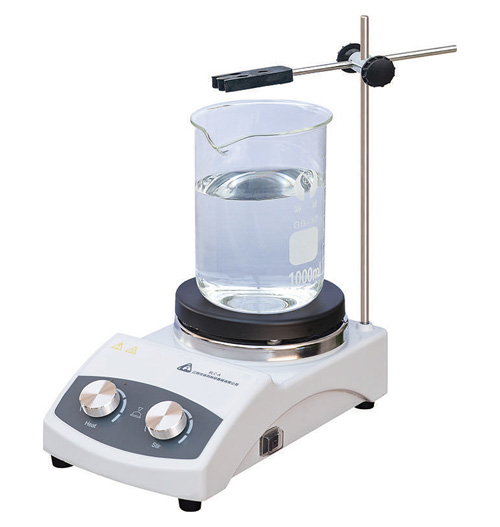3、把盛有溶液的容器放在工作臺(黑色電爐盤)中心,容器中放入適當攪拌子一個(平底容器用圓柱形攪拌子,球形容器用紡錘形攪拌子。容器不可是鐵以及與磁性有關的材料制成,底厚不應大于10mm。),調整溫度傳感器高度,使之距離容器底部10mm左右.當溶液少時,至少將其插入溶液10mm以上,以保證溫度測量的正確性。